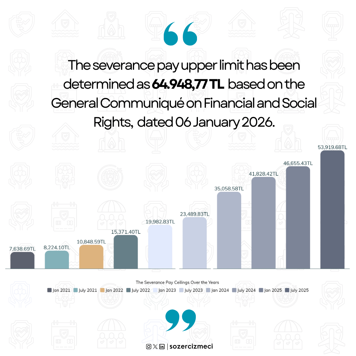 Within the framework of the provision of Article 14 of the Law No. 1475, it is stated that the annual amount of the severance pays shall not exceed the maximum retirement bonus to be paid for one service year to a highest civil servant subject to the Civil Servants Law in accordance with the provisions of the Republic of Turkey Retirement Funds Law N0. 5434. For this reason, the gross salary used in the calculation of the severance pay cannot exceed the maximum amount determined by the Ministry of Labor and Social Security once in six months.For the period between January 1, 2026 and June 30, 2026, the severance pay ceiling has been updated to 64,948.77 TRY. [17]. The basic formula for the calculation of the severance pay is to divide the gross salary to 365 days and multiple with the total number of employment days of the employee and deduct the stamp tax from the amount achieved.